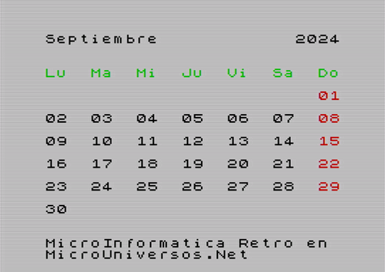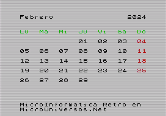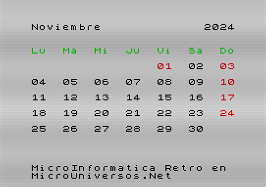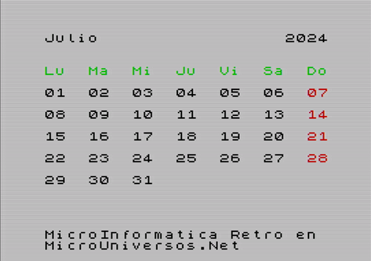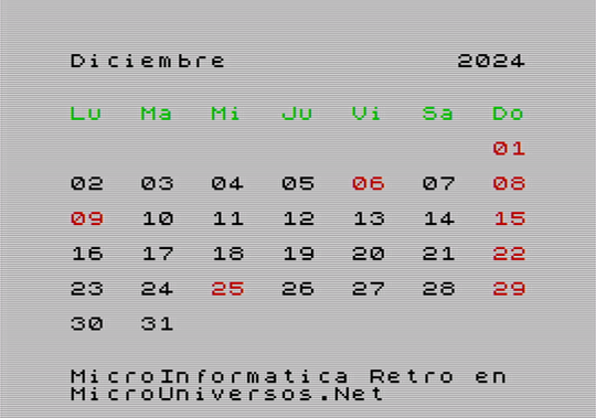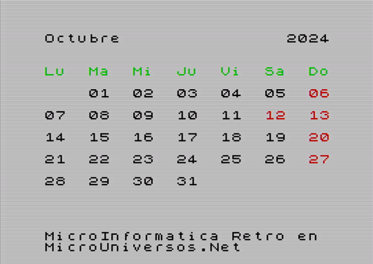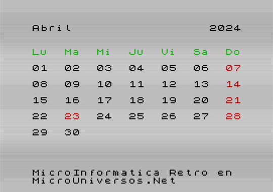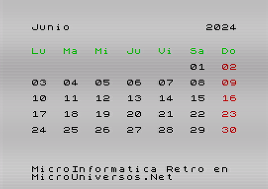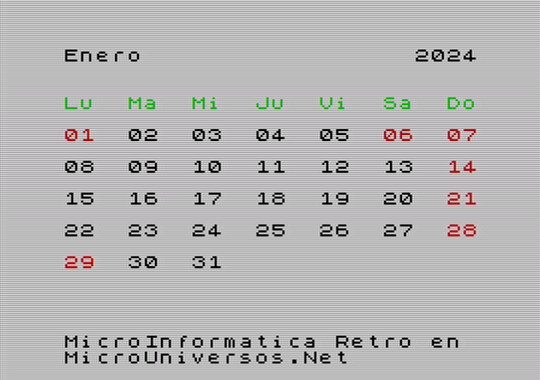 A continuación se muestran las pantallas correspondientes al calendario del año 2024, para cada uno de los meses, con gráficos en versión Spectrum. Quién desee tener su calendario maquetado con este estilo retro, puede descargarse las imágenes, seleccionando el mes correspondiente en la siguiente tabla: