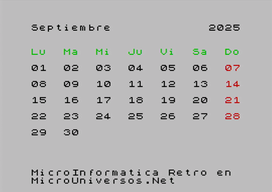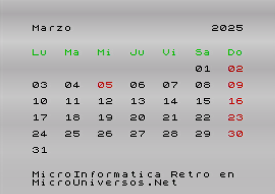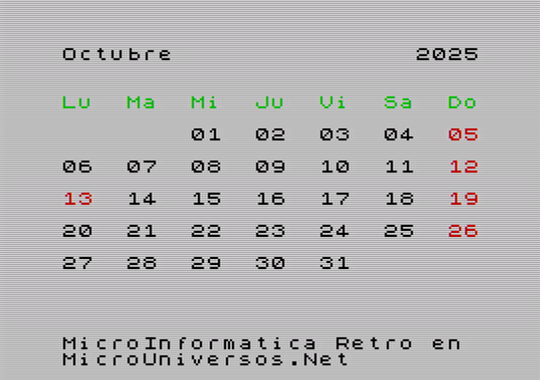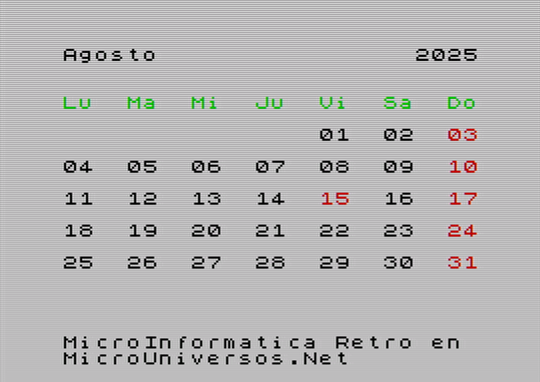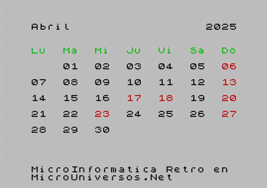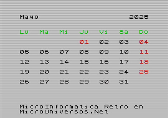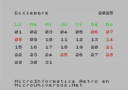 A continuación se muestran las pantallas correspondientes al calendario del año 2025, para cada uno de los meses, con gráficos en versión Spectrum. Quién desee tener su calendario maquetado con este estilo retro, puede descargarse las imágenes, seleccionando el mes correspondiente en la siguiente tabla: