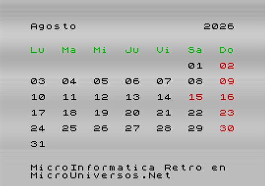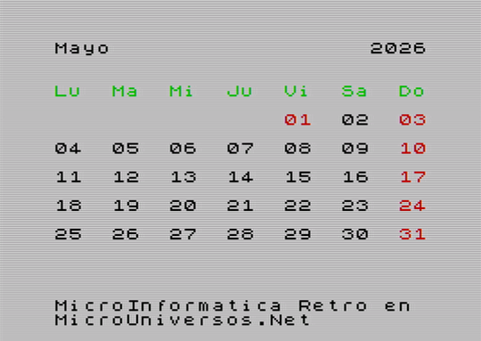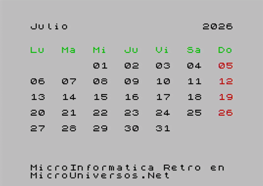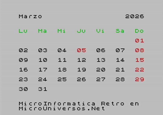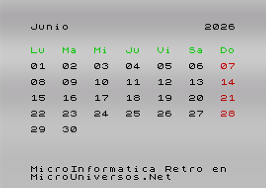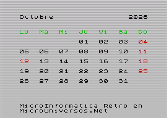 A continuación se muestran las pantallas correspondientes al calendario del año 2026, para cada uno de los meses, con gráficos en versión Spectrum. Quién desee tener su calendario maquetado con este estilo retro, puede descargarse las imágenes, seleccionando el mes correspondiente en la siguiente tabla: